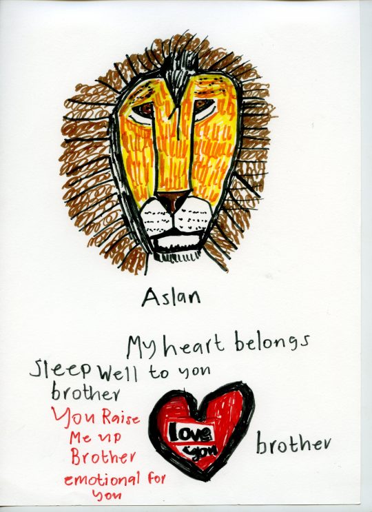 Reuben, aged 38, was living in a home for adults with learning disabilities. He hadn’t established an independent life in the care system and was still struggling to accept that he had Down’s syndrome. Depressed and in a fog of anti-depressants, he hadn’t spoken for over a year. The only way he expressed himself was by writing poems or drawing felt-tip scenes from his favourite West End musicals and Hollywood films. Increasingly isolated, cut off from everyone and everything he loved, Reuben sent a text message: ‘brother. do. you. love. me.’
