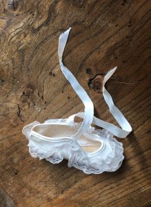 A single shoe pulled from the darkness of a drawer where it has spent many years. In my hand it is no longer than my index finger and only twice as wide. It is bird-like in weight but has an undertow of force for me. Filigreed with lace, coral-like; fragile, not from use but the passage of time. Faded now, but when given an expensive object chosen with love. Two grosgrain ribbons to tie at ankle, hand-sewn to the shoe: a pierce-through-pull-through of running stitch. A single shoe that never touched ground.