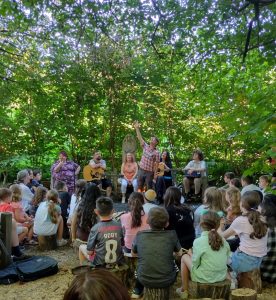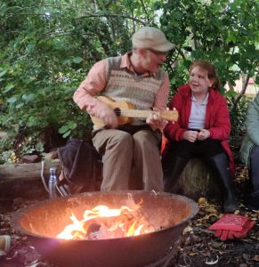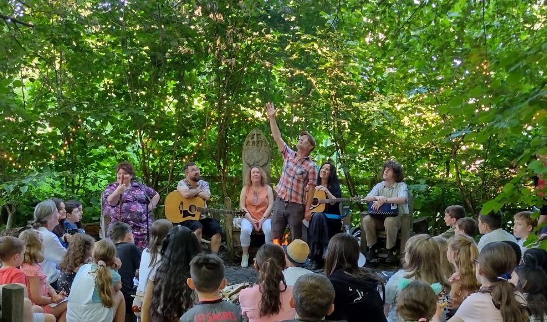 The day after the last of the seasonal storytelling sessions in Highfield Country Park, I’m invited to tell a story as part of the school’s summer solstice celebration held in their own outdoor education area. Once more, the fire is burning bright as we gather together – perhaps a hundred people including children with tin whistles, accordions and bodhrans. The folk music group is run by Angela Usher, who was recently awarded an MBE for services to music education, and it’s absolutely magical to hear so many young folk play instruments with such passion and enjoyment. Another local resident and professional folk musician, Rionagh Connolly, sings a summer solstice song in Gaelic Irish, accompanied by her husband Ellis Davies on guitar. The whole circle is held in a magical, musical spell; it’s as if the sun itself has stopped to listen.