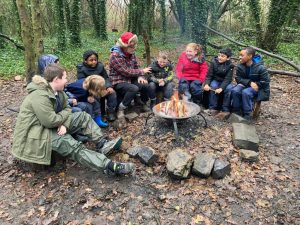 As Jane and Freya go to fetch the children from school, I’m in charge of tending the fire; which has suddenly started to sulk. But half an hour later, the flames are flickering brightly. I hear the children approaching – cheerily chattering like goldfinches as they walk into the woods, their feet kicking through the fallen leaves. Like a hunter hidden amongst the trees, I see them long before they see me. It’s an innately pleasing feeling afforded by the forest – seeing without being seen – one that the children themselves come to relish during the sessions in the woods.