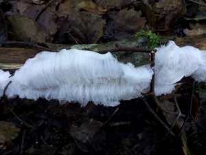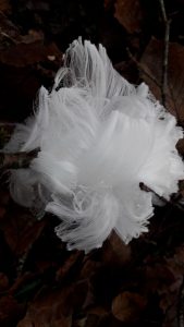 So interested to read about feather frost. I saw it many times in the beechwoods when I lived in Brittany – once joined to Devon, of course, with a similar climate. Ours was less ‘wiglike’ than in your pictures, shorter hair that grew along the dead branch, making it look as if dipped in icing sugar. I haven’t seen it anywhere else, but this winter, now living in the Creuse, I wrote the following: ‘Today, with a heavy frost, the winter leaves and dead moss are hoisted on a platform of ice crystals about 6 millimetres high, millions of tiny props which crunch like cornflakes under my clumsy boots. It feels like vandalism to crush them, each one so perfect, but I have no option.’ And wonder if this is a related phenomenon?