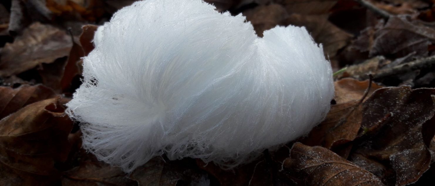 How do the ‘hairs’ of ice stay separated and distinct, rather than forming into a single chunk of ice, which is what usually happens at these temperatures? The reason is surprising. Like many questions in nature, the answer is a fungus. In this case it’s Exidiopsis effusa, a waxy, greyish, low-growing species, a fact that was only determined as recently as 2015 by a team of scientists in western Germany, which discovered that it was this species of fungus that enabled the filaments to segregate as they emerged from the rays in the wood. Water near the surface of the wood freezes on contact with the cold air; more water is drawn by suction outwards away from the wood, where it too becomes ice, adding a new layer, and so on, incrementally through the night. The chemical properties of the fungus inhibit the crystallisation processes of the ice, maintaining the slender, distinct nature of each strand. The scientists found that in more than half their sample, Exidiopsis effusa was the only fungus present. They then analysed the ice itself and found that it contained the compounds lignin and tannin, by-products of the life processes of the humble fungus that enables the formation of this extraordinary phenomenon.