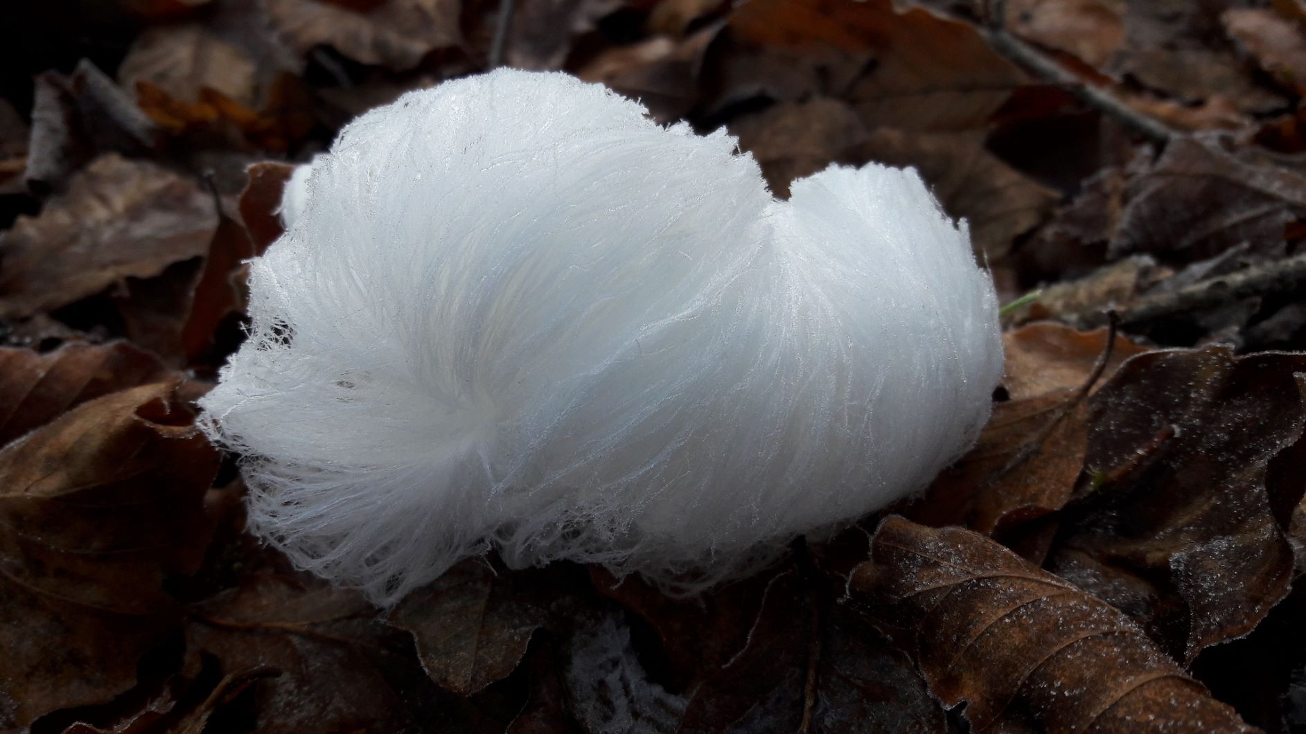 From stubby twigs or chunks of wood, ones that were especially replete with water, come the most spectacular flowers of frost. These are the ones that splay out in all directions, making a coiffured confection of delicate ice. Sometimes gravity, and perhaps the gentlest breath of wind, swirls them into candyfloss curlicues that resemble nothing else in the natural world. On the very best specimens, it’s impossible to see the wood whence all this ice has emanated. A pompom of teased and twizzled whiteness nestles in the crunchy leaves like a formless creature from a vintage psychedelic children’s programme.